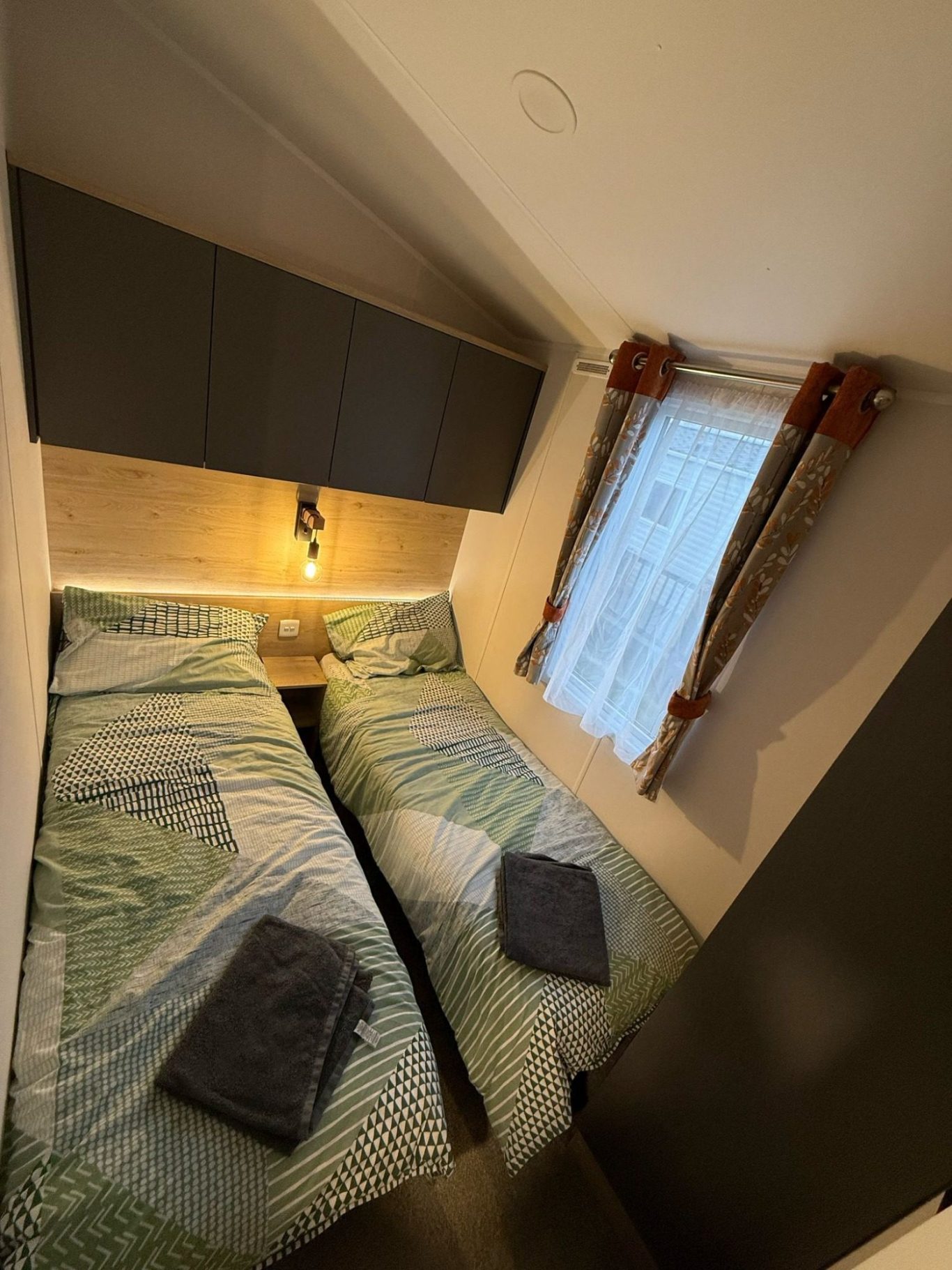 This is a twin room with good size beds, a small wardrobe and bed side lamp.