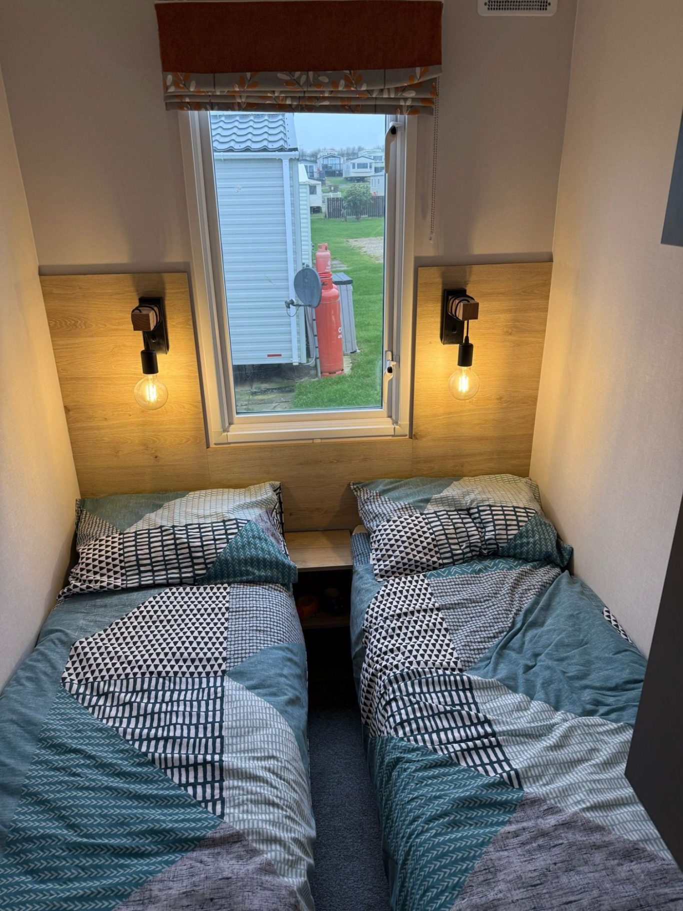 This is a twin room with good size beds, a small wardrobe and bed side lamp.