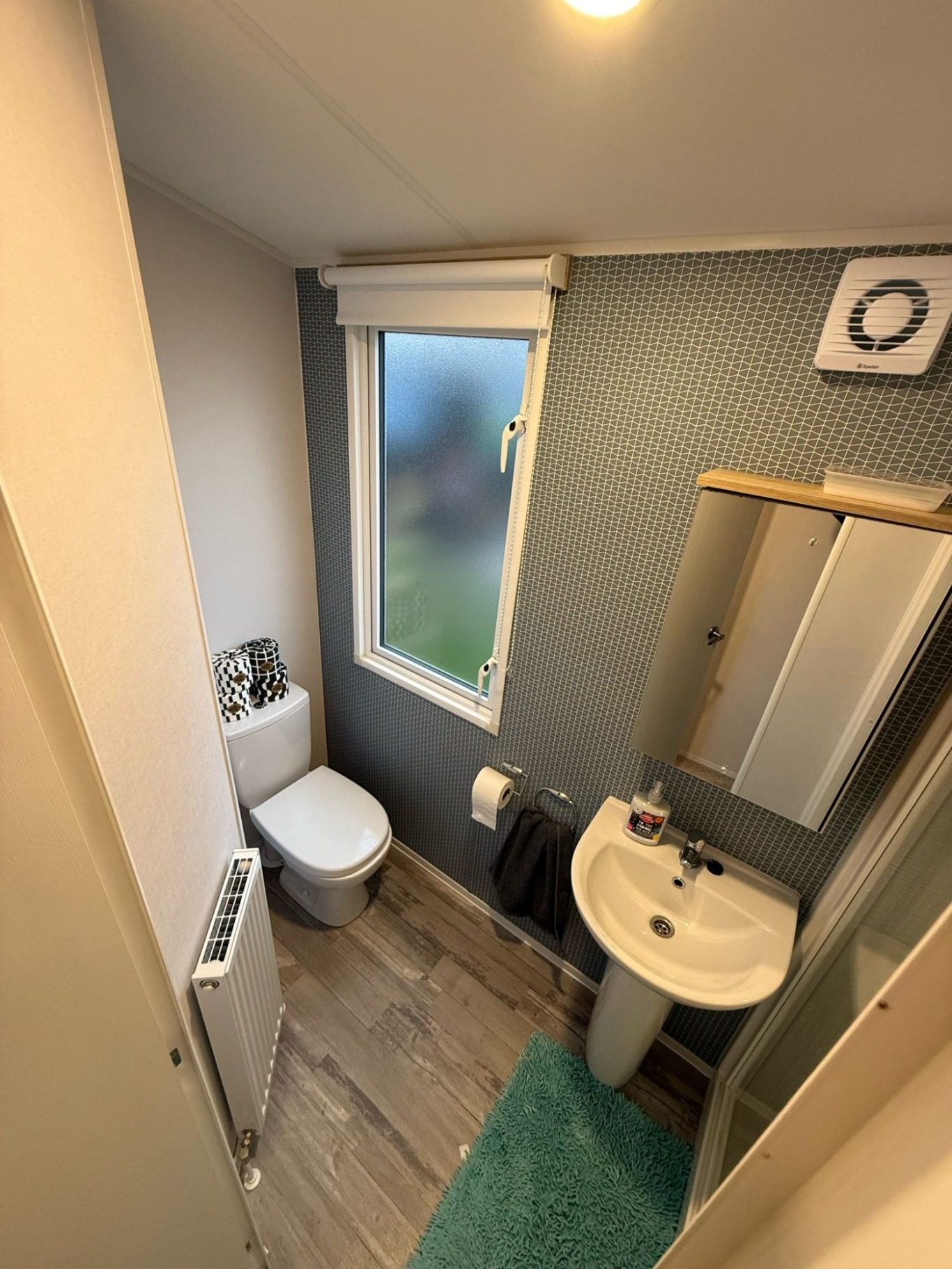 The main bathroom has a good size shower cubicle, storage for your toiletries, hooks for your towels and a radiator.